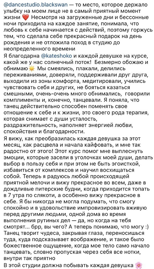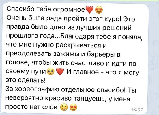 Танец может многое. Я прожила большое количество жизненных ситуаций танцуя и хочу показать вам, как эмоции и наши чувства могут проходить через наше тело и танец. Многим людям нужна поддержка и общение в определенный период жизни, я хочу это дать и вдохновить этим прекрасным творчеством каждую девушку. Быть собой и любить себя это здорово.